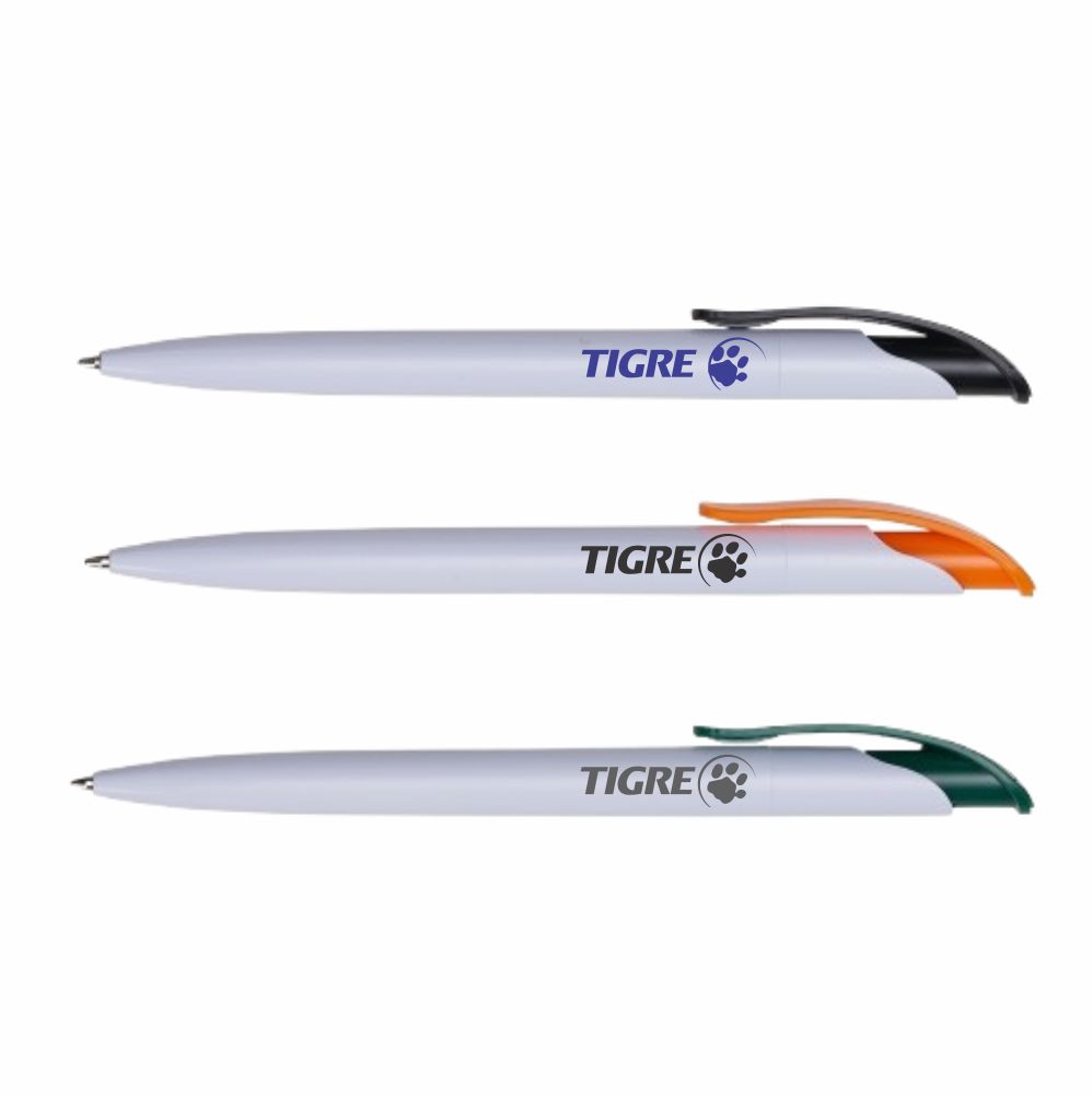 Caneta esfero plástica branca com clip colorido